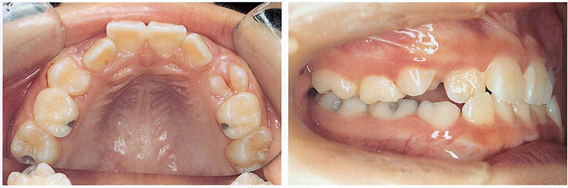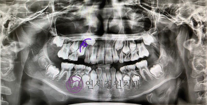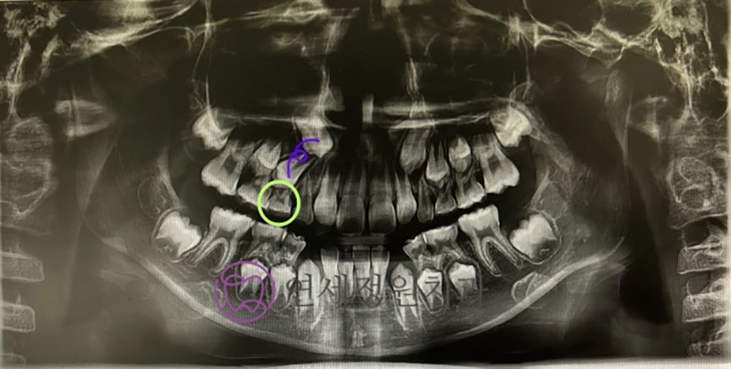 Because his baby teeth were coming out later than usual, I took a panoramic X-ray during a routine check-up. It showed that his upper right canine and first premolar were not aligned properly. The premolar was tilted backward, blocking the canine from erupting.