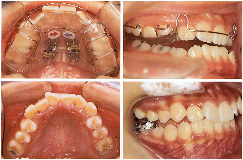 In a similar textbook case, a patient who wore a sagittal appliance had dramatic results: both impacted canines erupted naturally, and the crossbite was corrected—avoiding the need for extraction orthodontics later.