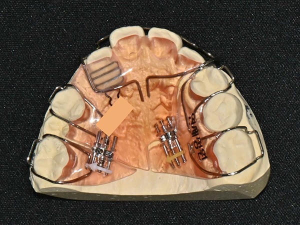 This appliance includes push springs to move the incisors forward and distal screws to expand the space for the premolars—one of the most complex and precise devices to make!