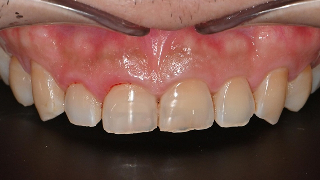 The patient’s primary concern was long-term bruxism. Due to years of tooth grinding, generalized tooth wear and fractures had developed, making the teeth appear thinner and darker. In particular, the patient was concerned that his front teeth looked uneven and short when smiling.